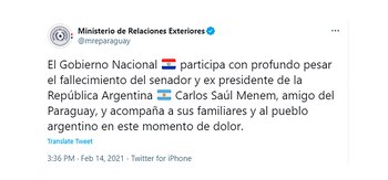 La Cancillería paraguaya trasladó el pésame del Gobierno a través de su cuenta de Twitter y se refirió al expresidente fallecido como un “amigo del Paraguay”. “El Gobierno Nacional de Paraguay participa con profundo pesar el fallecimiento del senador y expresidente de la República Argentina Carlos Saúl Menem, amigo del Paraguay, y acompaña a sus familiares y al pueblo argentino en este momento de dolor”, publicó la Cancillería paraguaya en su cuenta de Twitter.