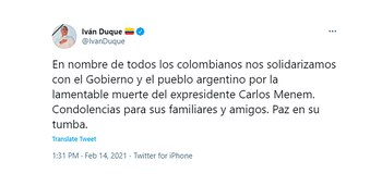 EL colombiano Iván Duque también recurrió a su cuenta de Twitter para despedir al argentino. “En nombre de todos los colombianos nos solidarizamos con el Gobierno y el pueblo argentino por la lamentable muerte del ex presidente Carlos Menem. Condolencias para sus familiares y amigos. Paz en su tumba”, escribió.