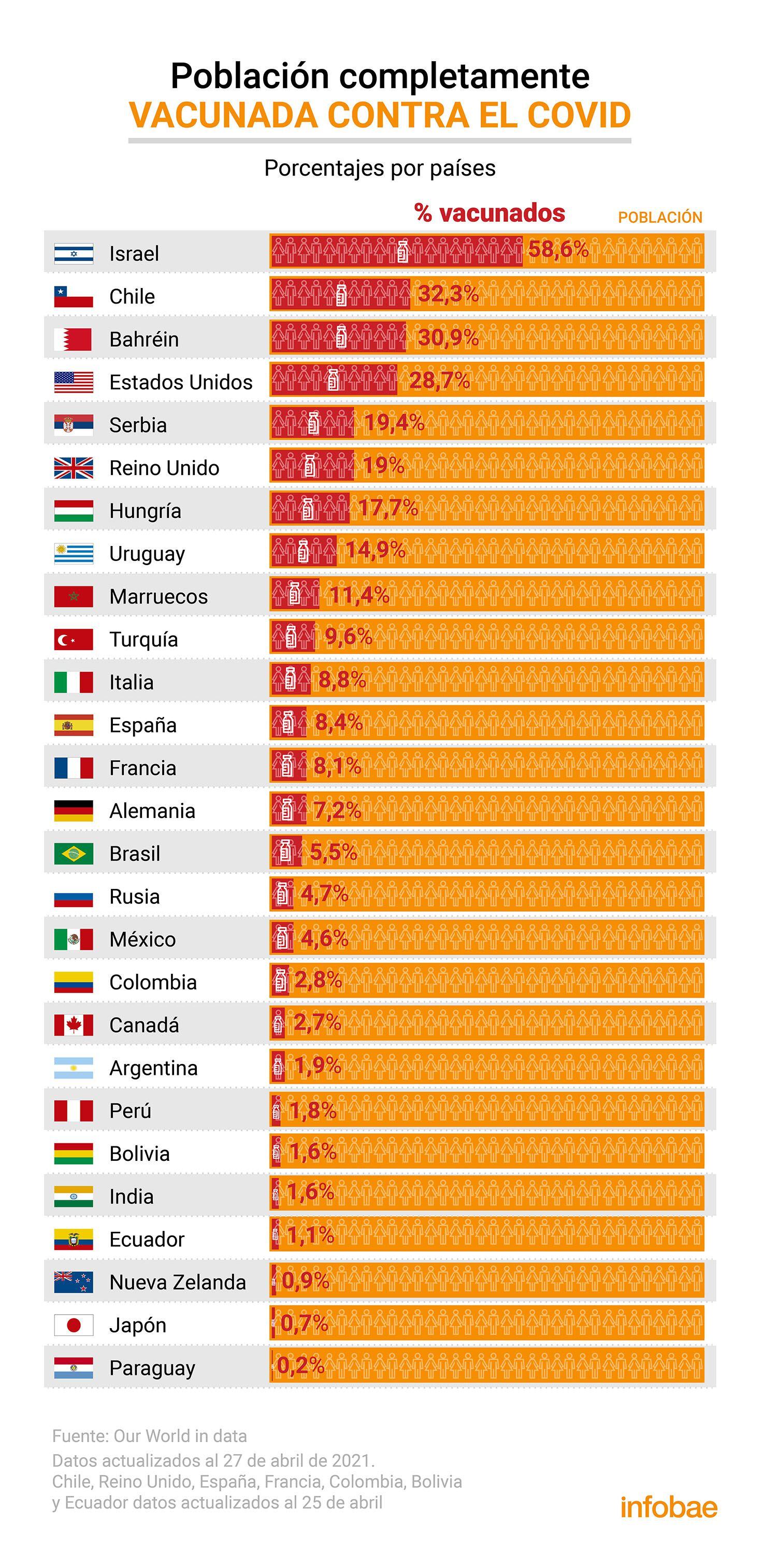 Los índices de vacunación además confirman que Chile supera a otras países que han tenido un avance rápido en el proceso de vacunación, como es el caso de Bahréin (30,6%), Estados Unidos (28,7%) y Reino Unido (19%).