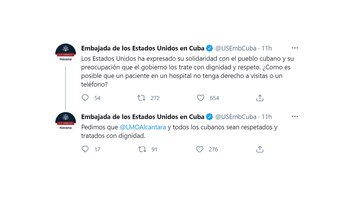 “Pedimos que @LMOAlcántara y todos los cubanos sean respetados y tratados con dignidad”, señaló en Twitter la embajada de Estados Unidos en La Habana. Washington “ha expresado su solidaridad con el pueblo cubano y su preocupación que el gobierno los trate con dignidad y respeto”, agregó.