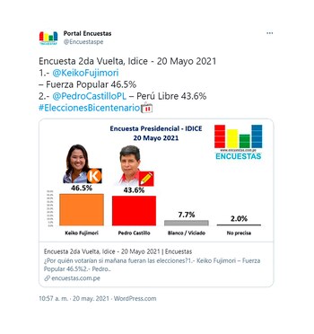 Según la encuesta publicada por la consultora del Instituto de Desarrollo e Investigación de Ciencias Económicas (IDICE) del Perú, la brecha entre Keiko Fujimori y el candidato de la izquierda Pedro Castillo se acortó: la candidata de Fuerza Popular se ubica en 45,4% y el profesor en un 42 por ciento.
