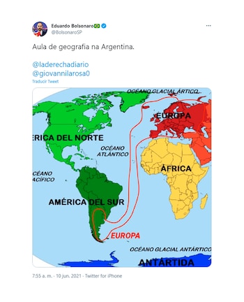 Este jueves, Eduardo Bolsonaro volvió a manifestarse respecto al tema a través de su cuenta en Twitter. “Clase de geografía en Argentina”, expresó en un mensaje que acompañó con una imagen de un mapa en el que marcó como Europa al continente en cuestión y a la Argentina.