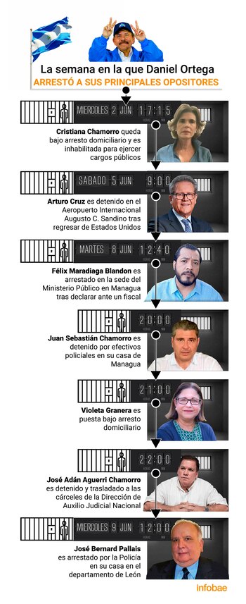 La justicia también arrestó al ex presidente del Consejo Superior de la Empresa Privada (Cosep), José Aguerri, al ex vicecanciller José Pallais (miembro del bloque opositor denominado Coalición Nacional), y a la dirigente opositora Violeta Granera, a quien luego suspendieron el arresto domiciliario y trasladaron a la cárcel.
