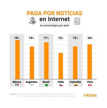 Estos niveles relativamente bajos de confianza pueden relacionarse con la baja proporción de personas que pagan por noticias online: en promedio, sólo 16% paga por noticias a las que accede por internet, con un rango que va desde 12% en Chile a 18% en México.