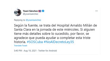 “Se nos mueren, se nos mueren... se nos mueren en sus casas, en los pasillos de los hospitales y en las salas de espera”, escribió Sánchez en su cuenta de Twitter. “Duele mucho ver, también, que el personal médico no tiene los suficientes medios de protección para el noble trabajo de salvar vidas que está haciendo”, agregó la activista cubana.