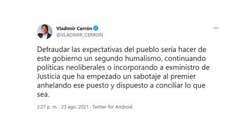 En uno de los mensajes en la red social, expresó: “Defraudar las expectativas del pueblo sería hacer de este gobierno un segundo humalismo, continuando políticas neoliberales o incorporando a un ex ministro de Justicia que ha empezado un sabotaje al premier anhelando ese puesto y dispuesto a conciliar lo que sea”. Cuando habla de “humalismo” se refiere a la administración del ex mandatario Ollanta Humala.