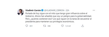 Antes, había manifestado: “Portada de hoy sigue con el mito que tengo gran influencia sobre el Gobierno. Ahora han añadido que soy un peligro para la gobernabilidad. Pero, ¿quiénes sostienen eso? Los que siguen en la tarea de secuestrar al presidente para mantener sus privilegios económicos”.