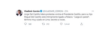 En otro mensaje, Cerrón expresó: “Jorge Del Castillo lidera protestas contra el Presidente Castillo, pero su hijo Miguel Del Castillo está íntimamente ligado a Palacio. ‘Juega en pared’, término muy usado en Lima. Secreto a voces”.