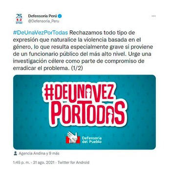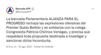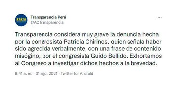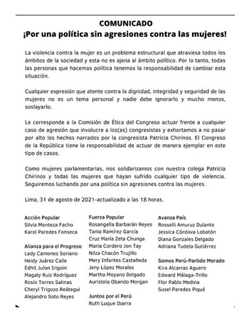 Un total de 27 parlamentarias de los partidos políticos Acción Popular, Fuerza Popular, Alianza para el Progreso, Avanza País, Somos Perú-Partido Morado y Juntos por el Perú firmaron un comunicado en el que pidieron que la Comisión de Ética actúe al respecto.