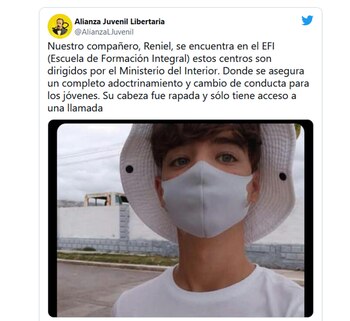 “Nuestro compañero Reniel se encuentra en el EFI (Escuela de Formación Integral). Estos centros son dirigidos por el Ministerio del Interior, donde se asegura un completo adoctrinamiento y cambio de conducta para los jóvenes. Su cabeza fue rapada y sólo tiene acceso a una llamada”, denunció la Alianza en su cuenta en la red social Twitter.