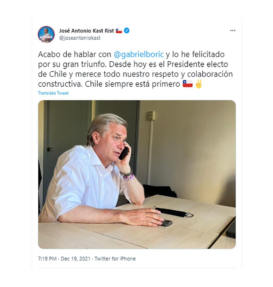 Una hora y medio después de cerrados los colegios electorales, y con una distancia ya irreversible, Kast reconoció la derrota. “Acabo de hablar con Gabriel Boric y lo he felicitado por su gran triunfo. Desde hoy es el Presidente electo de Chile y merece todo nuestro respeto y colaboración constructiva. Chile siempre está primero”, escribió en su cuenta de Twitter.