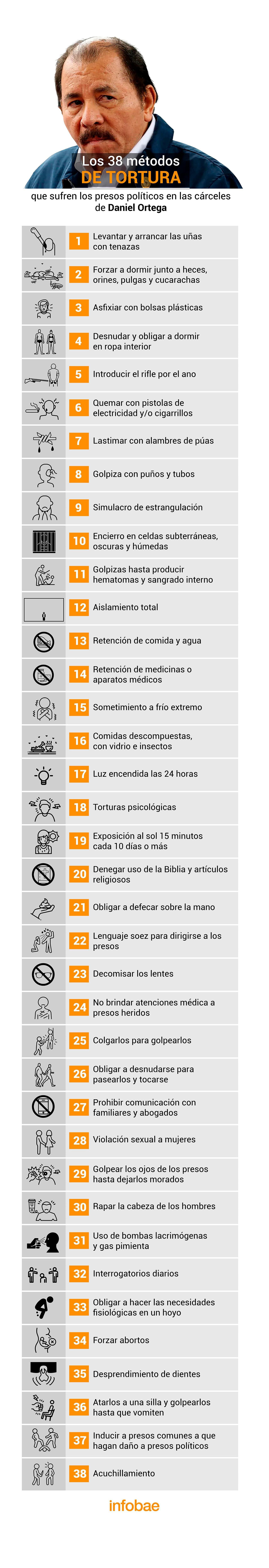 Los 38 métodos de torturas expuestos son: 1. Desprendimiento de uñas con tenazas. 2. Reclusión en sitios inmundos con ratas, cucarachas y pulgas. 3. Asfixia con bolsas plásticas. 4. Permanecer desnudos. 5. Introducción a hombres de rifles por el ano. 6. Quemaduras con pistolas de electricidad y/o cigarrillos. 7. Uso de alambres de púas. 8. Golpizas con puños y tubos 9. Intentos de estrangulación. 10. Permanencia en celdas subterráneas, oscuras y húmedas. 11. Golpes hasta producir hematomas y sangrado interno. 12. Aislamiento total. 13. Poca comida y agua. 14. Negación de medicinas o aparatos médicos a los presos políticos enfermos. 15. Sometimiento a fríos extremos.16. Entregan de comidas descompuestas, con vidrio e insectos. 17. Luz permanente para evitar el sueño. 18. Torturas psicológicas. 19. Sol 15 minutos cada diez días o más. 20. Negación de Biblia y artículos religiosos.