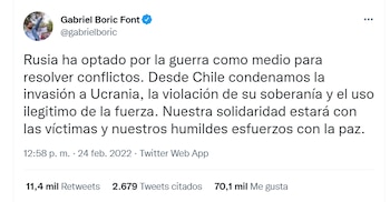 “Desde Chile condenamos la invasión a Ucrania, la violación de su soberanía y el uso ilegitimo de la fuerza. Nuestra solidaridad estará con las víctimas y nuestros humildes esfuerzos con la paz”, publicó en Twitter el exlíder estudiantil, en una declaración que fue de las más contundentes de los mandatarios de América Latina.