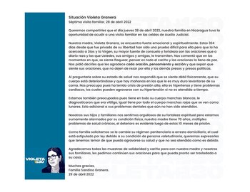 Esta semana, la familia Granera Sandino tocó las campanas de alarma por la salud de su madre, la presa política Violeta Granera. En un comunicado familiar difundido a través de medios de comunicación y redes sociales aseguran estar “sumamente alarmados por su condición física, nuestra madre tiene 70 años, múltiples problemas de salud crónicos, el deterioro es evidente después de estos 10 meses de prisión”.