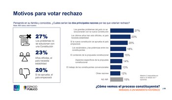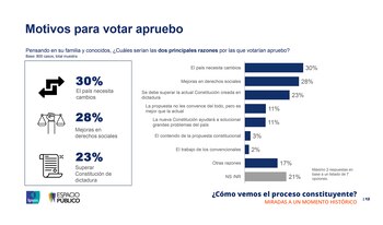 El 30% de los encuestados señaló que la principal razón por la que se debería aprobar la nueva Constitución es porque “el país necesita cambios”. Sin embargo, sólo el 11% sostiene que la nueva Carta Magna ayudará a solucionar los grandes problemas del país, y apenas el 3% dice que el principal motivo es por el propio contenido de la propuesta constitucional.