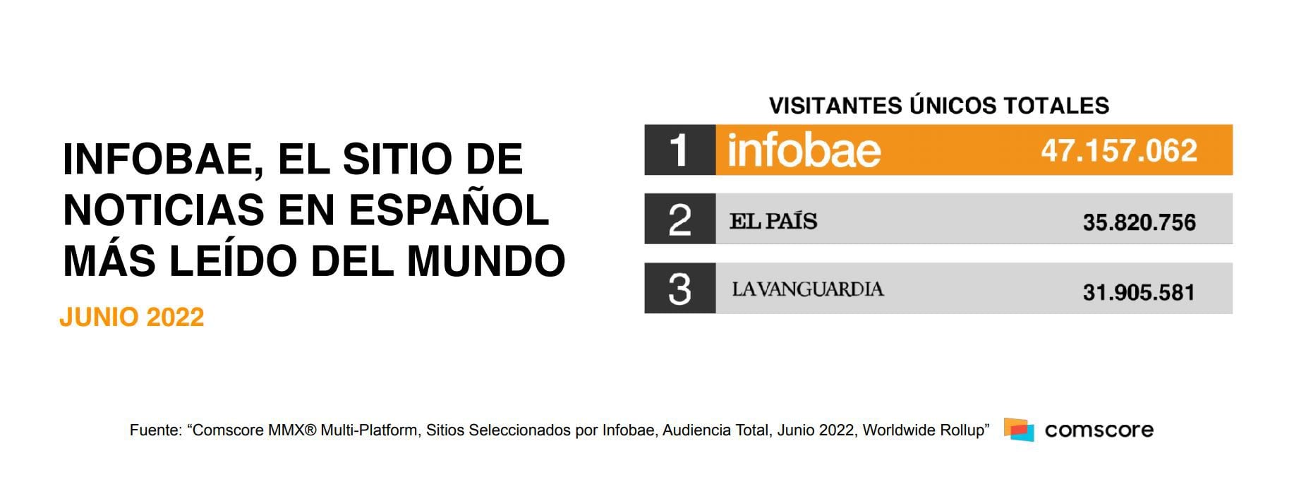 De acuerdo a Comscore -la compañía que audita las mediciones en todo el mundo-, en junio pasado Infobae alcanzó 47.157.062 millones de visitantes únicos, 12 millones por encima del diario español El País y 16 millones por sobre La Vanguardia, el otro periódico líder en habla hispana.