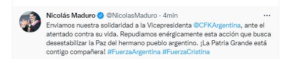 Mientras, el dictador venezolano, Nicolás Maduro, expresó su enérgico repudio en contra del suceso que tuvo lugar frente a la residencia de la vicepresidenta argentina.