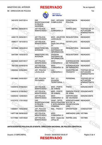La ficha del SGSP del 26 de setiembre de 2022 muestra que Astesiano tiene 31 indagatorias e incluye antecedentes penales, algo distinto a lo presentado en las anteriores fichas del hombre.