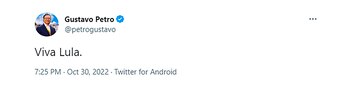 Petro, cercano a Lula, se hizo eco así del regreso del sindicalista a la Presidencia de Brasil, que ganó en segunda vuelta con el 50,66 % de los votos frente a su contrincante, el mandatario Jair Bolsonaro que consiguió el 49,35 %, con un 95,00 % contado.