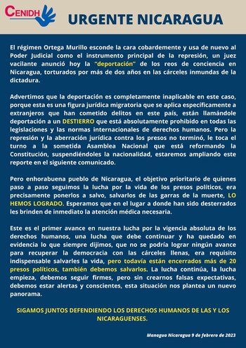 El Centro Nicaragüense de Derechos Humanos (CENIDH) reaccionó al hecho celebrando la excarcelación de los presos políticos, pero condenado el abuso que legal que se ha cometido. “Advertimos que la deportación es completamente inaplicable en este caso, porque esta es una figura jurídica migratoria que se aplica específicamente a extranjeros que han cometido delitos en este país, están llamándole deportación a un destierro que está absolutamente prohibido en todas las legislaciones y las normas internacionales de derechos humanos”, expresó en un comunicado.