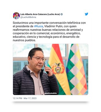 Y luego, el día en que la Corte Internacional de Justicia ordenó la detención de Putín por sus crímenes de guerra, lo llamó por teléfono: “Sostuvimos una importante conversación telefónica con el presidente de Rusia, Vladimir Putin, con quien reafirmamos nuestras buenas relaciones de amistad y cooperación en lo comercial, económico, energético, educativo, ciencia y tecnología para el desarrollo de nuestros pueblos”.