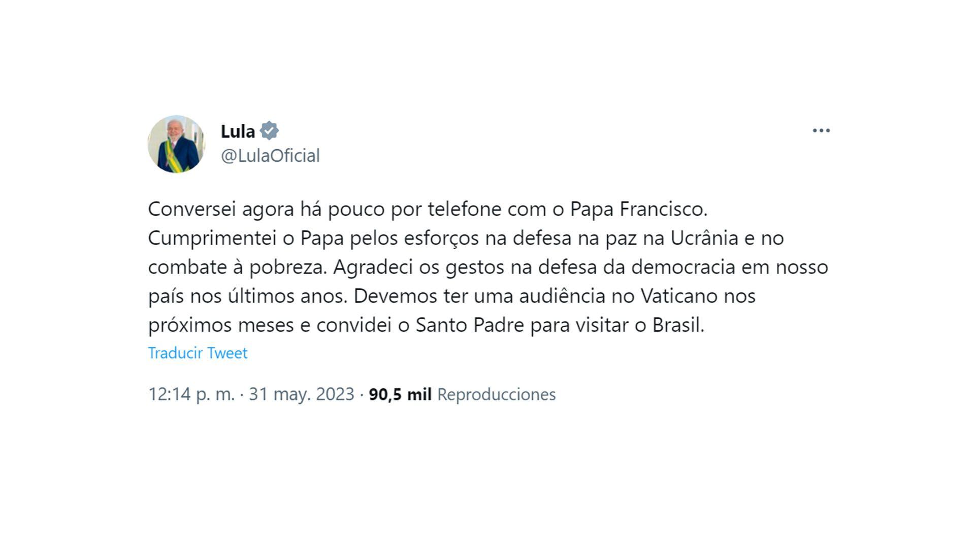 “Acabo de hablar por teléfono con el papa Francisco. Felicité al Papa por sus esfuerzos en la defensa de la paz en Ucrania y la lucha contra la pobreza”, expresó Lula en su cuenta de Twitter.