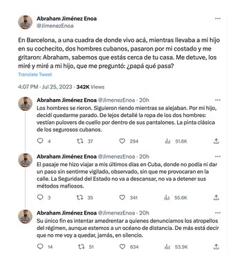 “En Barcelona, a una cuadra de donde vivo, mientras llevaba a mi hijo en su cochecito, dos hombres cubanos pasaron por mi costado y me gritaron: ‘Abraham, sabemos que estás cerca de tu casa’”, escribió Jiménez Enoa.