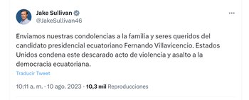 En un mensaje en Twitter, recientemente bautizado X, el consejero del presidente estadounidense Joe Biden dio el pésame a la familia de Villavicencio, muerto al ser alcanzado el miércoles por varios disparos tras un mitin.