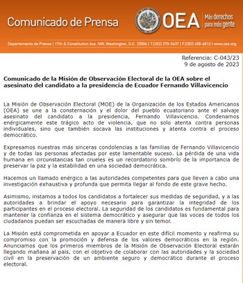La Organización de Estados Americanos (OEA),a través de su Misión de Observación Electoral, condenó este miércoles el “salvaje asesinato” del candidato a la presidencia de Ecuador, Fernando Villavicencio, y expresó que este acto de violencia no solo atenta contra las personas individuales sino que socava las instituciones y el proceso democrático.