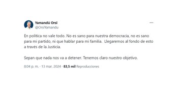 “Esta persona se confunde. Por supuesto que no era yo, o sería mucho más triste aún, que alguien la esté usando. Acá no se están metiendo solo con una fuerza política, ni con un candidato, sino con una persona y con la familia. Por lo tanto, a partir de este momento quienes van a hablar van a ser mis abogados, que van a ir a fondo”, declaró Orsi.