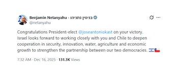 El primer ministro de Israel, Benjamin Netanyahu, se sumó esta jornada a la ola de felicitaciones de líderes internacionales al mandatario electo José Antonio Kast, mediante una publicación en su cuenta de X.