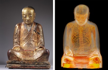 Sí. Dentro de la escultura había un cadáver en posición de flor de loto. Pero no se preocupen, esto no pilló desprevenidos a los trabajadores del centro. En 1997 ya se había descubierto que la estatua guardaba el cuerpo de un monje momificado mediante un exigente rito de automomificación en vida. Eso sí, la tomografía ha permitido estudiar su cuerpo, de unos mil años de antigüedad, como difícilmente se podría haber imaginado. En este caso podemos decir, literalmente, que la estatua tiene huesos.