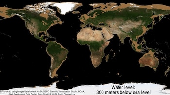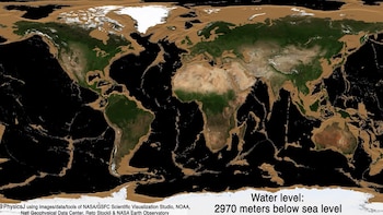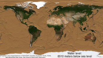 En el video de timelapse, el color marrón de la tierra seca avanza rápidamente, mientras que el azul de los mares cede a medida que las aguas descienden a más de 6.000 metros por debajo del nivel actual de las aguas.