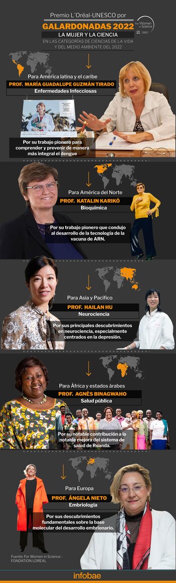 Premiada para América Latina y el Caribe 2022: María Guadalupe Guzmán Tirado, Cuba. Dedicada a las enfermedades infecciosas, especialmente en el tema dengue. Es directora del Instituto de Medicina Tropical Pedro Kouri, en La Habana, Cuba.