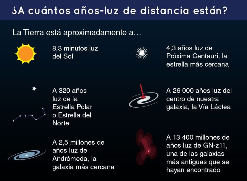 Nuestro Sol es la estrella más cercana a nosotros. Está a 150 millones de kilómetros de distancia. Así que la luz del Sol se toma 8,3 minutos para llegar hasta la Tierra. Esto significa que siempre vemos el Sol como era hace 8,3 minutos en el pasado. La siguiente estrella más cercana, después del Sol, está a 4,3 años luz, que son 41 millones de millones de km de distancia. Y cuando la vemos hoy, en realidad la estamos viendo como era hace 4,3 años en el pasado. Se cree que con la tecnología actual, el viaje a esta estrella nos tomaría 30.000 años. Todas las otras estrellas que vemos en el cielo son aún más distantes, muchas a miles de años luz.