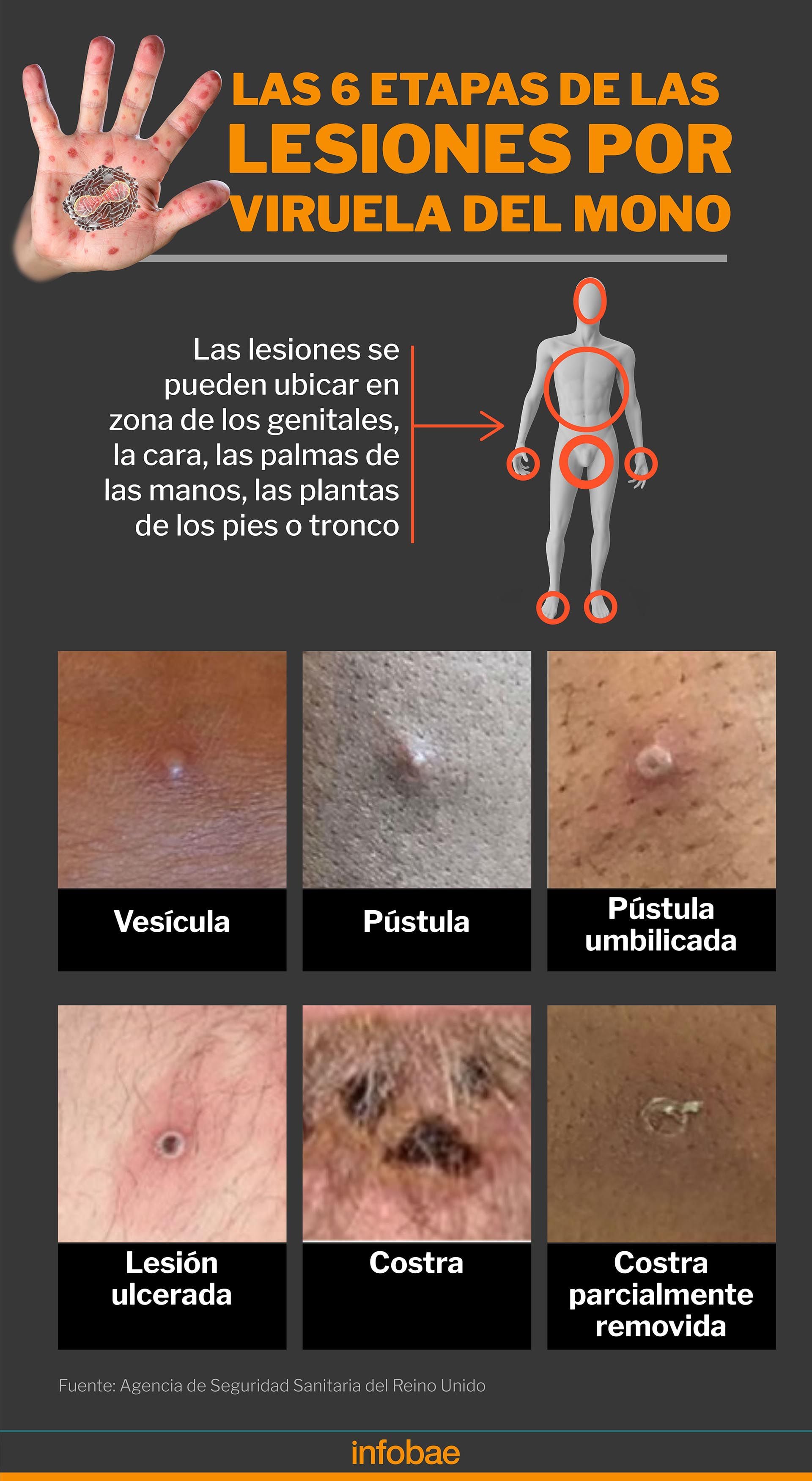 Las lesiones en la piel pueden atravesar 6 etapas y presentar en diferentes partes del cuerpo. Primero se puede formar una vesícula, luego una pústula, y después una pústula umbilicada. También se puede desarrollar también una lesión ulcerada, y luego una costra.