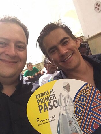 "Recibiendo la presencia de Su Santidad el Papa Francisco en compañía de Jorge Lara, hijo del Ministro de Justicia Rodrigo Lara Bonilla asesinado por órdenes de mi padre en 1984", escribió Marroquin en una de las fotos que compartió en dicha red social.