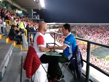 Solo había un hincha con la camiseta de Millonarios el día en que el equipo bogotano se coronó campeón del fútbol colombiano por decimoquinta vez. Y era uno que no podía ver ni oír nada. Todo lo interpretaba gracias a un hincha rival, del Santa Fe, que le narraba el partido con señales de las manos en un tablero de madera.