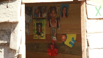 En Colombia, Karina plancha ropa ajena. En las tablas de su nueva casa, en la Villa, cuelgan portarretratos con fotos de fiestas de primera comunión. En otra imagen sus hijos abrazan a un tiburón inflable, mascota del equipo de fútbol local. "Dios bendiga este hogar", se lee escrito con letra roja temblorosa en la fachada, pintada de blanco.