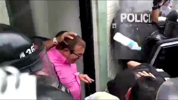 "Asesino", "terrorista", fueron los gritos que con megáfono le dirigieron al hoy candidato presidencial, tanto a su llegada como a su salida del lugar. El repudio al ex guerrillero incrementó cuando los manifestantes le tiraron huevos y agua.