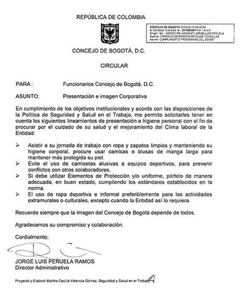 Circular emitida x director administrativo del @ConcejoDeBogota obedece a sugerencia hecha por el COPASST y la ARL, sin embargo la presidencia del concejo no fue consultada, he ordenado retírala de manera inmediata.