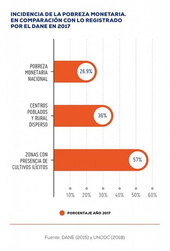 Pese a que el 94% de las familias encuestadas afirmó ser propietarias de las plantaciones de coca, el tamaño promedio de los lotes de sembrado no supera la media hectárea; lo que quiere decir que muchos no ganarían más del 28% del salario mínimo vigente. Y solo el 13% de ese total cuenta con documentos que los certifican como dueños. Por estas razones, el 57% de los hogares cocaleros sufren de pobreza monetaria, cuando el porcentaje en el resto del territorio rural del país es de 36, según el DANE.