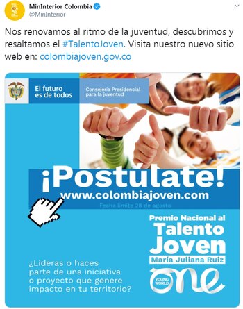 Después de la polémica el gobierno afirmó que todo se trataba de un "error involuntario" que causó la desinformación sobre el nombre del premio, que en efecto contó con un gran despliegue de piezas publicitarias en las que se lee "Premio nacional al Talento Joven- María Juliana Ruiz".