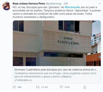 El gimnasio también emitió un comunicado rechazando el maltrato a los animales y señalando que por años han colaborado con organizaciones de la ciudad dedicadas a su protección: “Cuadrilátero censura y lamenta los hechos sucedidos. El maltrato animal es inaceptable y no hace parte de nuestros valores como empresa. Desde que hubo conocimiento del caso se ha ordenado la investigación para imponer las sanciones disciplinarias a que haya lugar”.