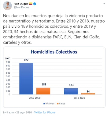 El presidente de Colombia, Iván Duque, expresó en Twitter: “Nos duelen los muertos que deja la violencia producto de narcotráfico y terrorismo. Entre 2010 y 2018, nuestro país vivió 189 homicidios colectivos, y entre 2019 y 2020, 34 hechos de esa naturaleza. Seguiremos combatiendo a disidencias FARC, ELN, Clan del Golfo, carteles y otros”.