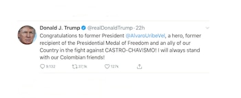 Felicitaciones al expresidente Álvaro Uribe, un héroe, antiguo merecedor de la Medalla Presidencial de la Libertad y un aliado de nuestro país en la lucha contra el Castro-Chavismo! Yo siempre apoyaré a nuestros amigos colombianos!