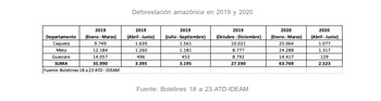 El más reciente estudio de la Fundación para la Conservación y el Desarrollo Sostenible (FCDS), “Alarmas prendidas por la deforestación en 2020”, reportó la altísima deforestación en los departamentos más afectados son Caquetá, Meta y Guaviare. En total Colombia ha perdido unas 75.000 hectáreas de bosque.