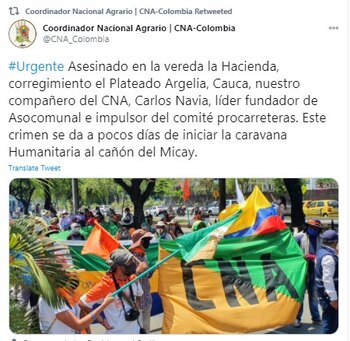 Públicamente el Coordinador Nacional Agrario de Colombia (CNA) denunció el crimen y recalca que este asesinato se presenta a pocos días del inicio de la Caravana Humanitaria al Cañón del Micay, que se realizará desde el 29 de octubre hasta el 1 de noviembre.
