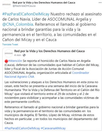 Otras organizaciones sociales como la Red por la Vida y los Derechos Humanos del Cauca rechazaron el asesinato y reiteraron el llamado al Gobierno Nacional “a brindar garantías para la vida y la permanencia en el territorio a las comunidades en el Cañón del Micay en el Cauca”.