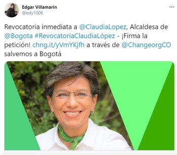El pasado 24 de octubre Edgar Villamarín, quien se describe como uribista, hizo una convocatoria en Twitter para que los ciudadanos que estén en desacuerdo con la administración de la alcaldesa de Bogotá, Claudia López, firmen una petición en el portal Change.org a fin de revocar su mandato.
